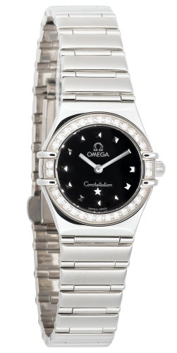 Blending refined European design with glittery diamond-accented style, this Omega Constellation women's watch offers graceful lines and a slender width for even the more delicate of wrists. Offering an appealing balance of luxury, durability, and precision (with its Swiss quartz watch movement), this Constellation will capture attention immediately as you walk into the ballroom (or boardroom) with its shiny, fully diamond encrusted silver stainless steel bezel. The silky smooth silver stainless steel bracelet band flows seamlessly from the case and is slightly tapered. It's composed of alternating wide links and contrasting thin bands, and is joined by a secure push-button safety clasp.The deep black dial background also includes silver tone baton hands and square, multi-faceted hour markers that reflect light like diamonds. Other features include a scratch-resistant and glare-proofed domed sapphire crystal, a distinctive Cabochon crown, and water resistance to 50 meters (165 feet) The watch case measures 22.5mm (0.89 inches) across and 8mm (0.31 inches) deep.